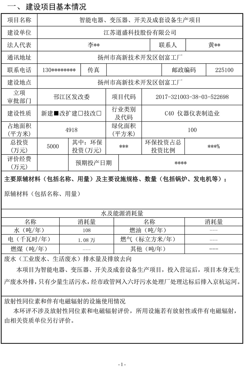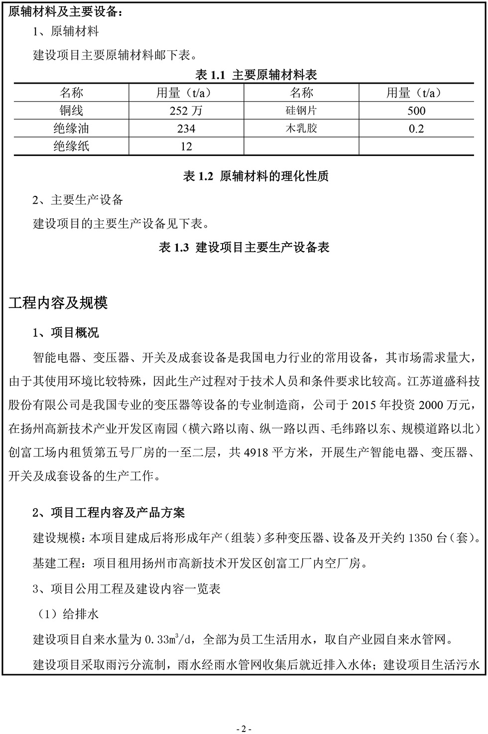 江蘇道盛科技股份有限公司 智能電器、變壓器、開關(guān)及成套設(shè)備生產(chǎn)項(xiàng)目報(bào)告表(公示版)